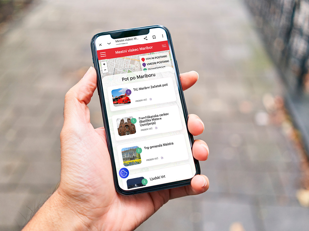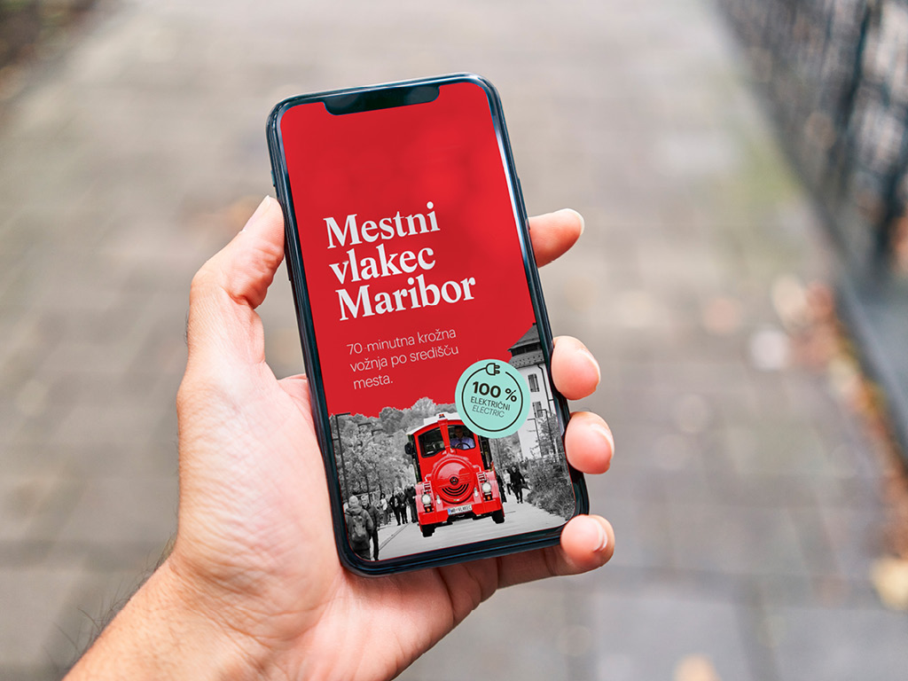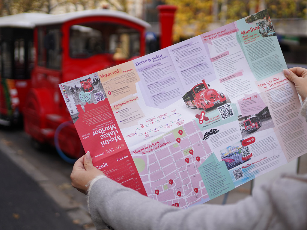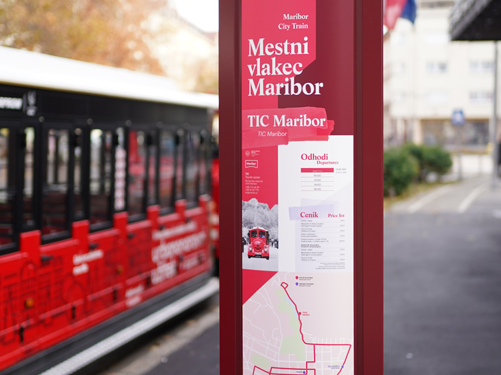 Navdih smo našli v gibanju skozi mesto. V poteh, postankih in razgledih, ki jih Mestni vlakec povezuje v smiselno celoto. Vizualni jezik izhaja iz zemljevida kot osrednjega elementa – ne zgolj kot navigacije, temveč kot povabila k odkrivanju mestnih zgodb, znamenitosti in skritih kotičkov. Celostna zasnova tako povezuje fizični prostor mesta z digitalnimi in tiskanimi mediji v enotno, prepoznavno izkušnjo. Z usklajeno uporabo barv, ikonografije in tipografije smo ustvarili sistem, ki deluje jasno v urbanem prostoru, berljivo na zaslonu in privlačno v tisku. Poleg zemljevida smo zasnovali pristajalno spletno stran, prilagojeno mobilnim uporabnikom, ki omogoča pregled poti, postajališč in dodatnih informacij. V fizičnem prostoru so komunikacijo nadgradile nalepke za toteme in nadstreške, ki zagotavljajo jasno orientacijo in prepoznavnost projekta v mestu. Celoto dopolnjujejo digitalni bannerji in tiskani plakati, zasnovani kot del enotnega vizualnega sistema.